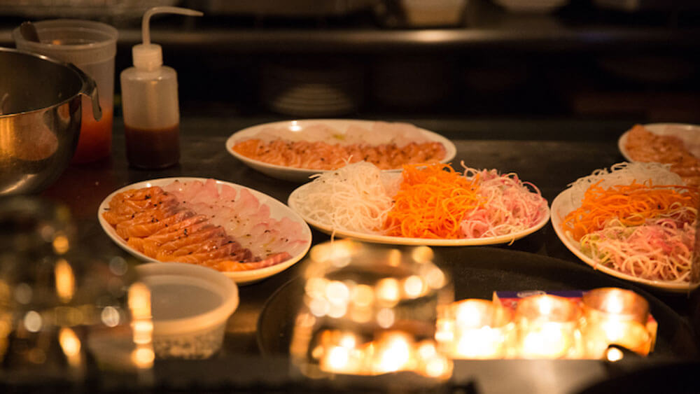 Raw fish and other ingredients for yusheng at the Momofuku Ssam Bar in New York serves a raw fish salad known as yusheng for its lo hei celebration of the New Year. (Ester Segretto)