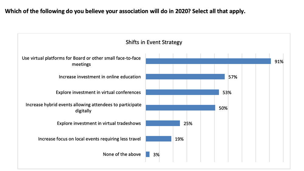 - A recent survey found that more than half of association executives indicated their association had canceled or postponed a face-to-face meeting. Thirty-five percent said efforts are being made to expand virtual access to programming, and 9 percent said they moved an event to a different location.