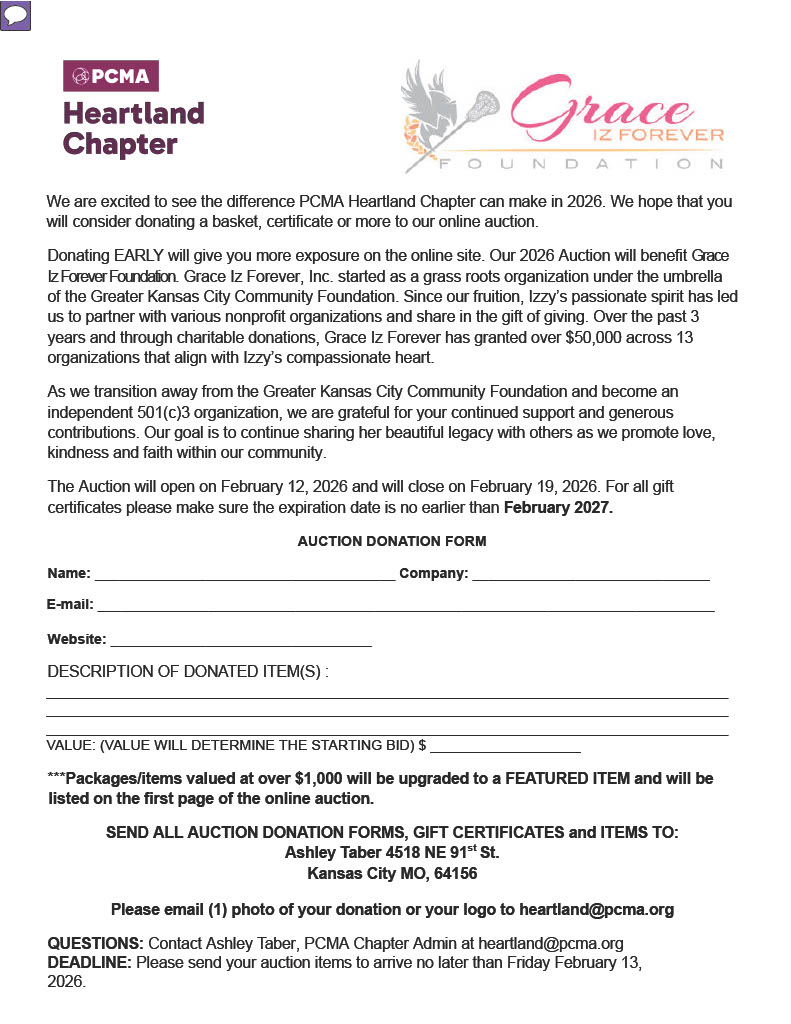 The evening will include our Chapter’s fund-raising auction. We are excited to see the difference PCMA Heartland Chapter can make in 2026. We hope that you will consider donating a basket, certificate or more to our online auction. Donating EARLY will give you more exposure on the online site. Our 2026 Auction will benefit Grace Iz Forever Foundation. Grace Iz Forever, Inc. started as a grass roots organization under the umbrella of the Greater Kansas City Community Foundation. Since our fruition, Izzy’s passionate spirit has led us to partner with various nonprofit organizations and share in the gift of giving. Over the past 3 years and through charitable donations, Grace Iz Forever has granted over $50,000 across 13 organizations that align with Izzy’s compassionate heart. As we transition away from the Greater Kansas City Community Foundation and become an independent 501(c)3 organization, we are grateful for your continued support and generous contributions. Our goal is to continue sharing her beautiful legacy with others as we promote love, kindness and faith within our community.