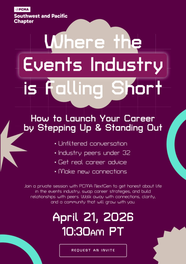 Join a private virtual think tank session with our PCMA SWP Next Gen peers to get honest about life in the events industry, swap career strategies, and build relationships with peers. Walk away with connections, clarity and a community that will grow with you! This is our inaugural webinar hosted by the PCMA Southwest & Pacific Next Gen Committee and we are starting by listening and gathering feedback from this community to better understand the challenges, build conversations, and create momentum. As a value add of your membership, this is a complimentary webinar. But you must request an invite to get the webinar invite.