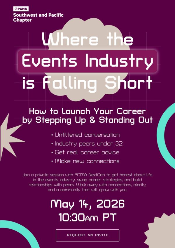 Join a private virtual think tank session with our PCMA SWP Next Gen peers to get honest about life in the events industry, swap career strategies, and build relationships with peers. Walk away with connections, clarity and a community that will grow with you! This is our inaugural webinar hosted by the PCMA Southwest & Pacific Next Gen Committee and we are starting by listening and gathering feedback from this community to better understand the challenges, build conversations, and create momentum. As a value add of your membership, this is a complimentary webinar. Join us May 14th at 10:30am PST, but first, you must request an invite to get the webinar invite.