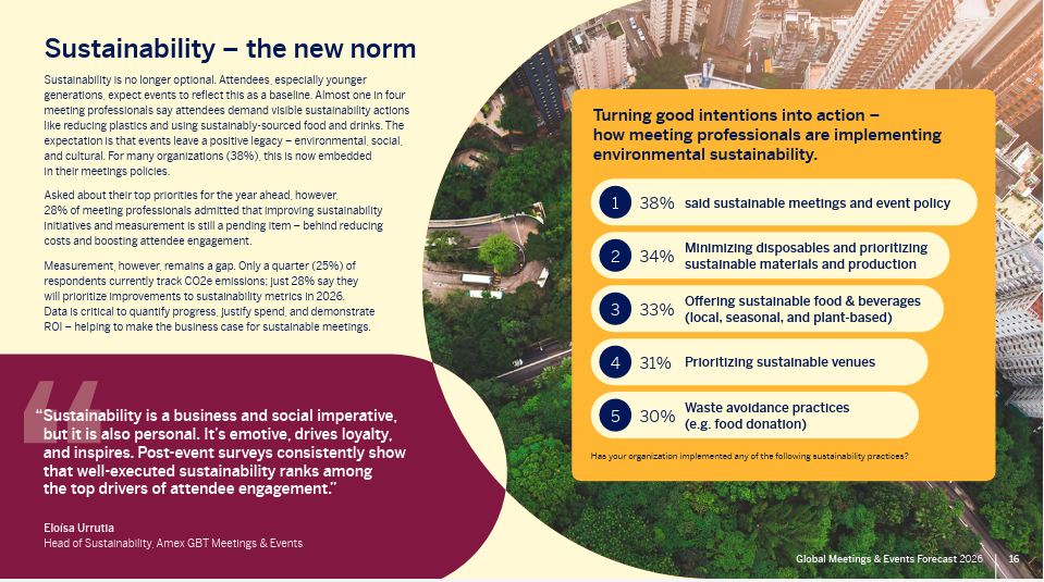 - 31 percent are prioritizing sustainable venues — 23 percent said a key factor for destination and venue selection in 2026 is sustainability impact assessment.