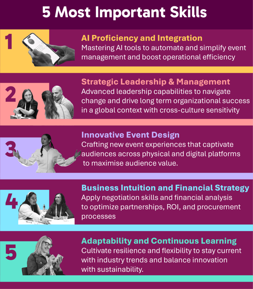 In terms of the capabilities they are seeking to develop in the coming year, AI once again rose to the top — mastering AI tools to simplify event management and boost operational efficiency. The second-most sought-after skill is strategic leadership and management. Respondents said they are interested in developing advanced leadership capabilities to navigate change and drive organizational success in a global context with cross-culture sensitivity. Data-driven decision making to inform strategic planning and demonstrate event value was the third top skill respondents want to pursue. Coming in fourth is innovative event design — creating experiences that captivate audiences across physical and digital platforms. And rounding out the top five: cultivating robust, long-term partnerships to drive business growth.