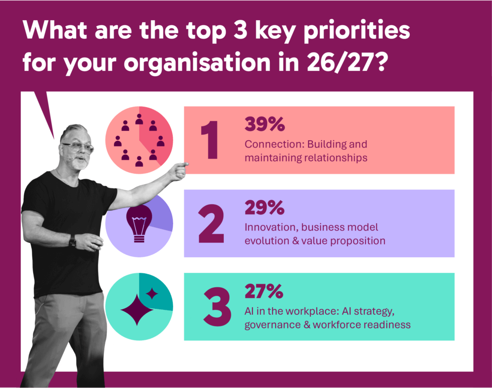 When 272 business events professionals were asked to pick their organization’s three key priorities, human connection was their most popular choice, chosen by 39 percent (up 6 points from last year’s survey) — which not only speaks to their own goals in their jobs but also to the larger work they do in convening people face to face. The next-most popular response was innovation, business model evolution, and value proposition, chosen by 29 percent of survey takers, reflecting an awareness of the need to creatively adapt in a rapidly changing geopolitical and economic environment. And no surprise, AI — in the workplace, strategy, governance, and workforce readiness — also was top of mind (at 27 percent).