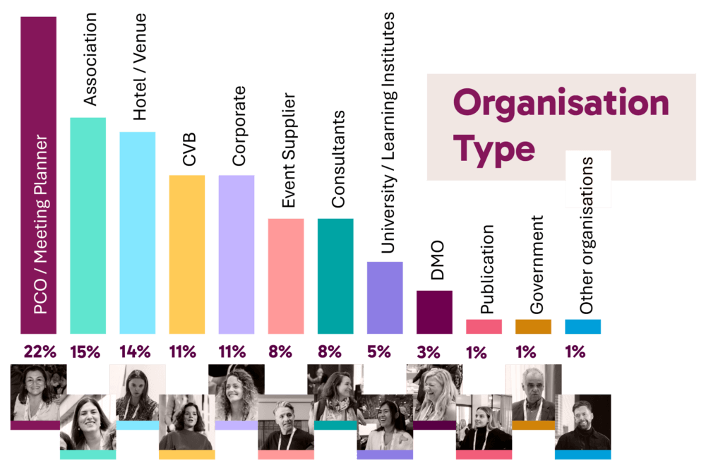 Out of the 272 professionals who responded to the survey, conducted in January and early February, 72 percent are from Europe, 16 percent from North America, and 4 percent each from Africa and the Middle East. This year’s results also include input from a handful of respondents each in the LATAM and APAC regions. The largest percentage of respondents (19 percent) work for organizations that are in the PCO/meeting planner/DMC category, followed by associations and hotels (13 percent each), CVBs (11 percent), and corporate (10 percent). Eight percent identified as consultants and 7 percent more generally as event suppliers.