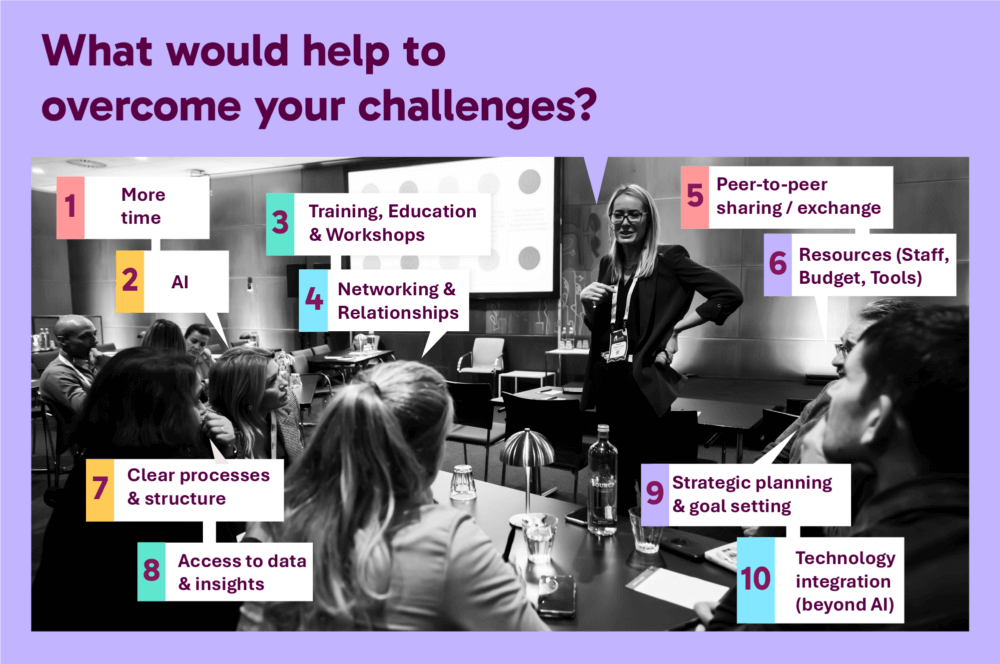 When asked what would help them to overcome their challenges, “more time” was the most often-cited sentiment. AI came up as a solution next most often, followed by training, education, and workshops. And once again, respondents returned to the theme of connection as being key to addressing issues: networking, relationships, and peer-to-peer sharing appeared often as responses to the open-ended question.