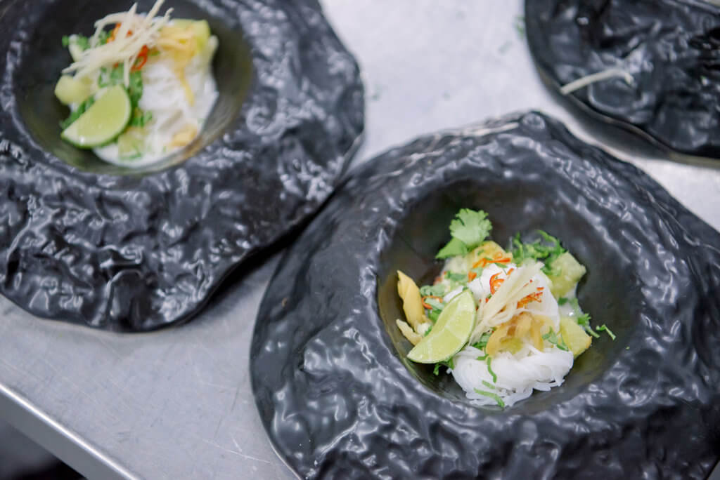 Prior to our meal, which was part of a fam trip hosted by the Thailand Convention and Exhibition Bureau in September, Songvisava and Jones gave our group of journalists a taste of this approach with a hands-on workshop. At one station, we sampled and noted the differences between several varieties of organic Thai bananas and mangoes. At another, we attempted one of the many processes the restaurant team employs to recycle its waste. For example, paper is never thrown away — it’s turned back into beautiful seeded paper that can then be used for business cards and menus.