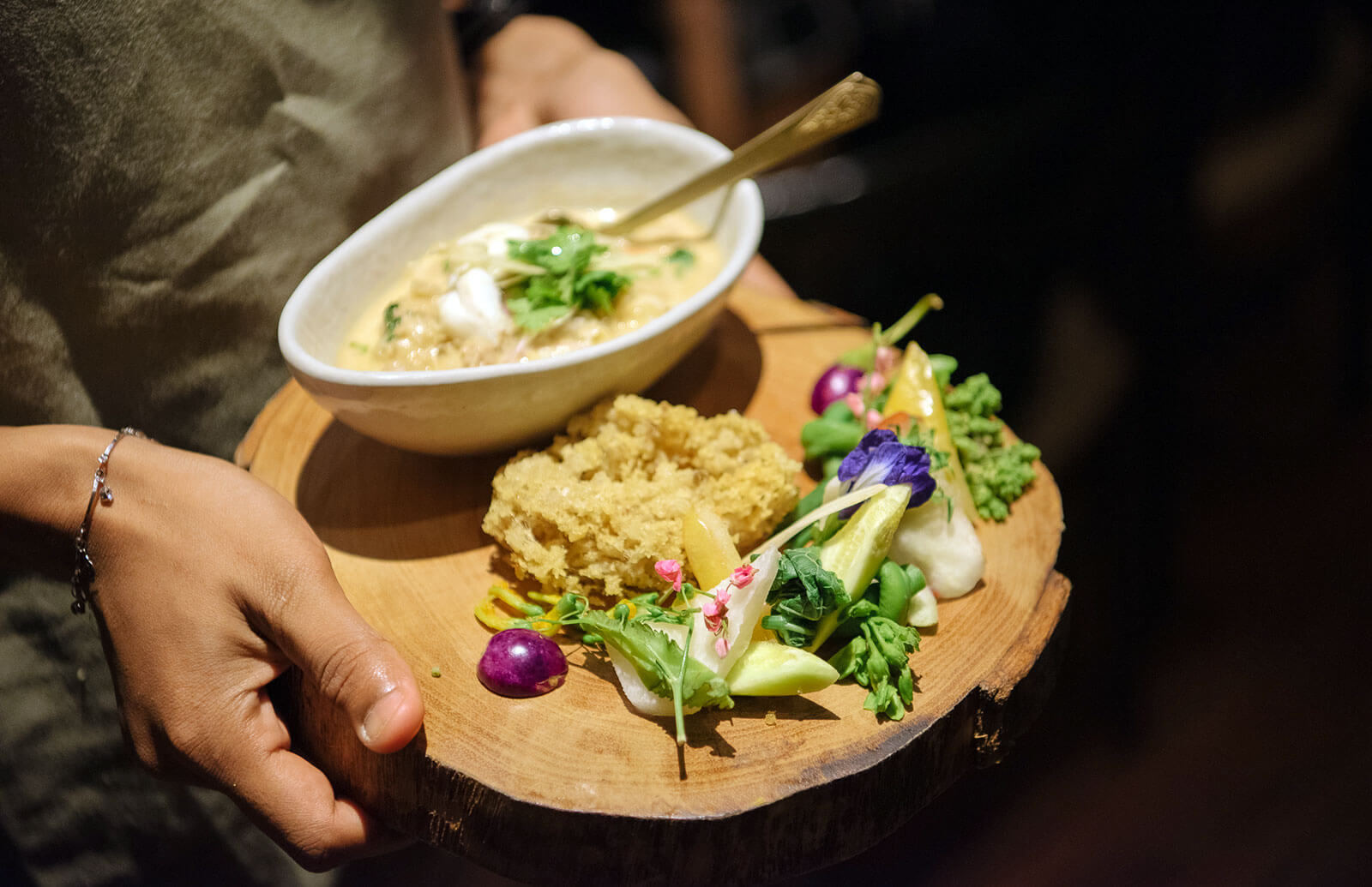 Coconut cream relish of Satul blue swimmer crab served with local greens and crispy fish cake and clear soup of Chacheongsao duck, young coconut, Thai basil, and tapioca pearls.