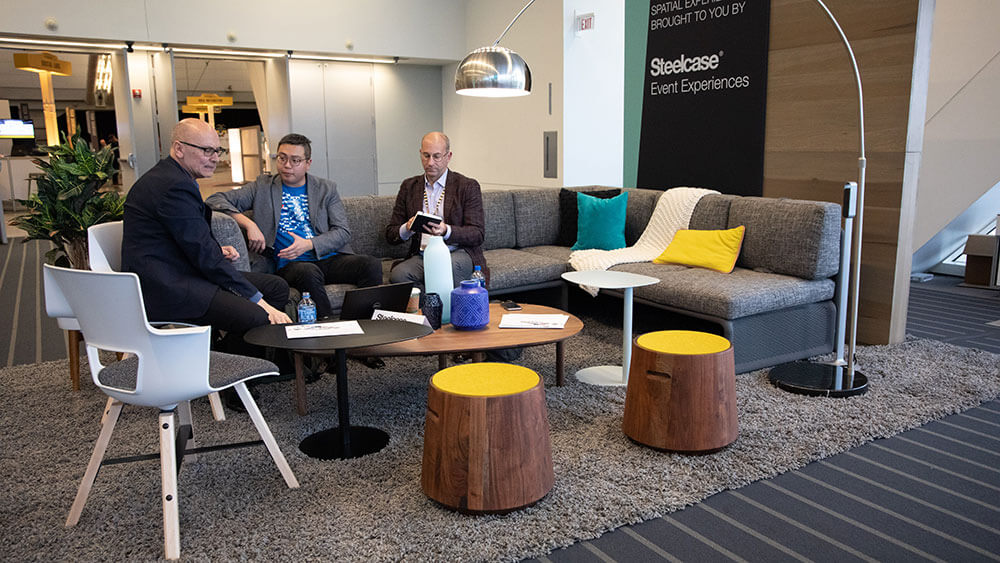 The lounge, which occupied a roomy corner at the David L. Lawrence Convention Center, was designed and furnished by Steelcase Event Experiences, a division of Steelcase, a 100-year-old furniture manufacturing company. Along with utilitarian considerations — people needed places to sit and talk — Steelcase Event Experiences planned an environment that would enhance participants’ experience and maximize collaboration, grouping chairs, sofas, tables, lamps, and accessories in supportive ways and choosing shapes, fabrics, and textures that created a sense of ease and well-being.