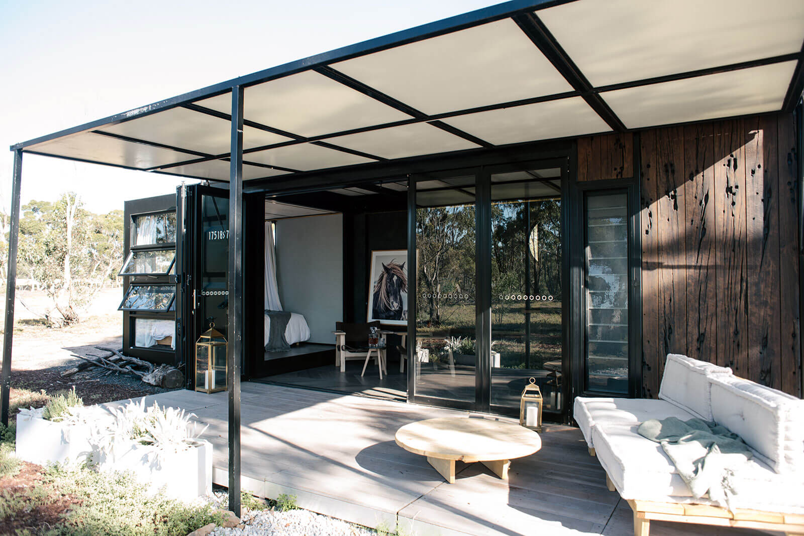 Floor-to-ceiling bi-fold doors open to a deck outside the converted shipping containers. (Daniel John Bilsborough Photography)
