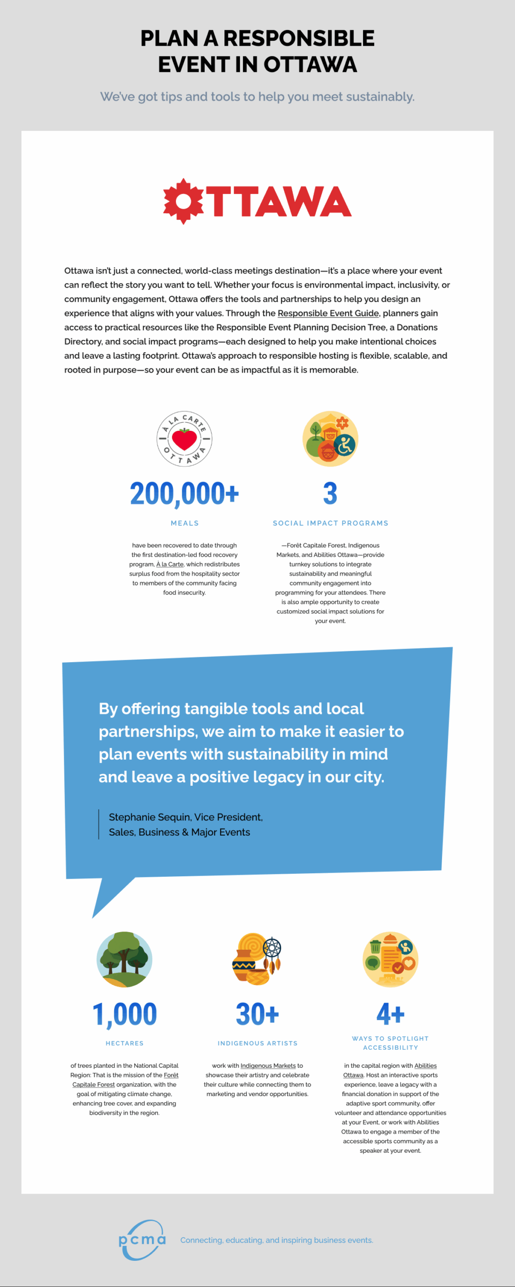 To start planning a sustainably minded event in Ottawa, download the Resposible Events Guide; contact Nicholas Litt of Meetings and Conventions Team; or visit us here.