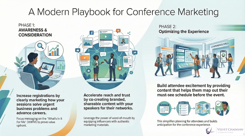 A number of years ago, Velvet Chainsaw developed a framework for crafting your conference narrative. The framework aligns with a conference’s attendee journey and can be helpful for developing your content marketing plan — phase 1: awareness/consideration; phase 2: optimizing the experience; phase 3: capture/amplify; phase 4: memories/learning prompts.
